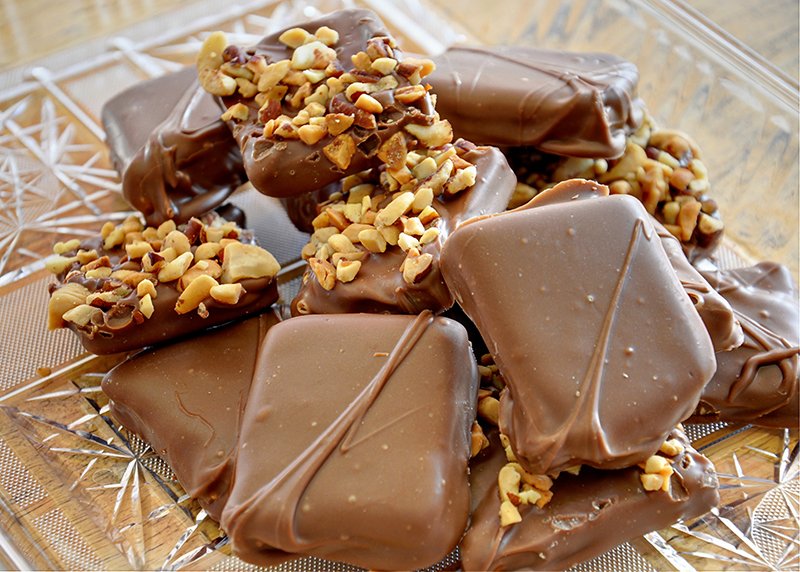 Homemade Kandy Kitchen English Toffee is a sweet and addicting treat made with a hard candy layer topped with chocolate and chopped pecans.